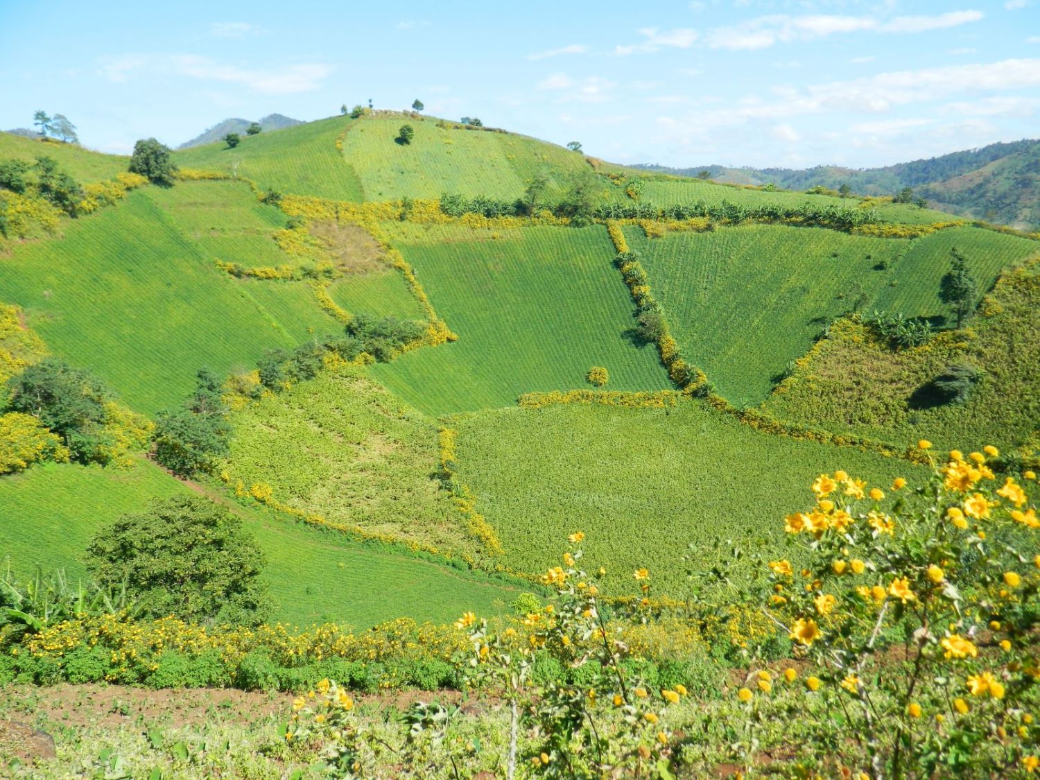 Trong mùa mưa, Chư Đăng Ya được khoác lên mình màu xanh ngắt của những ruộng hoa màu và ruộng khoai, mở ra vô số bức tranh sinh động đến tận chân trời. Khi mùa khô đến, núi lại thay đổi vẻ ngoài với lớp áo màu vàng óng ả của những bụi hoa dã quỳ, rực rỡ khắp triền đồi.