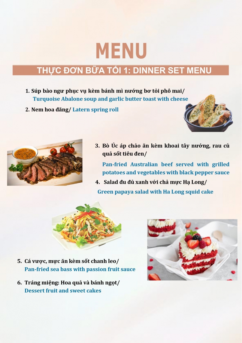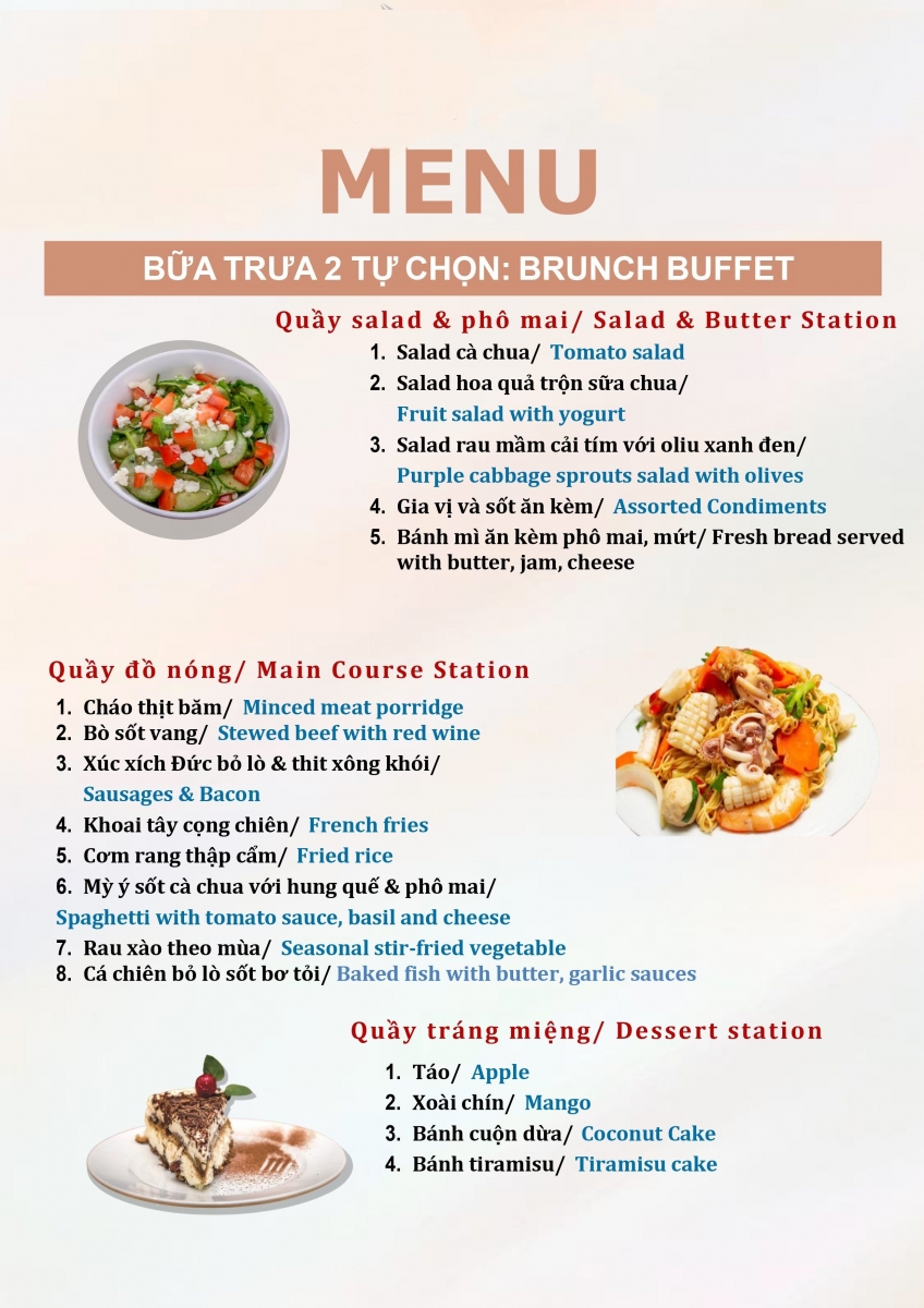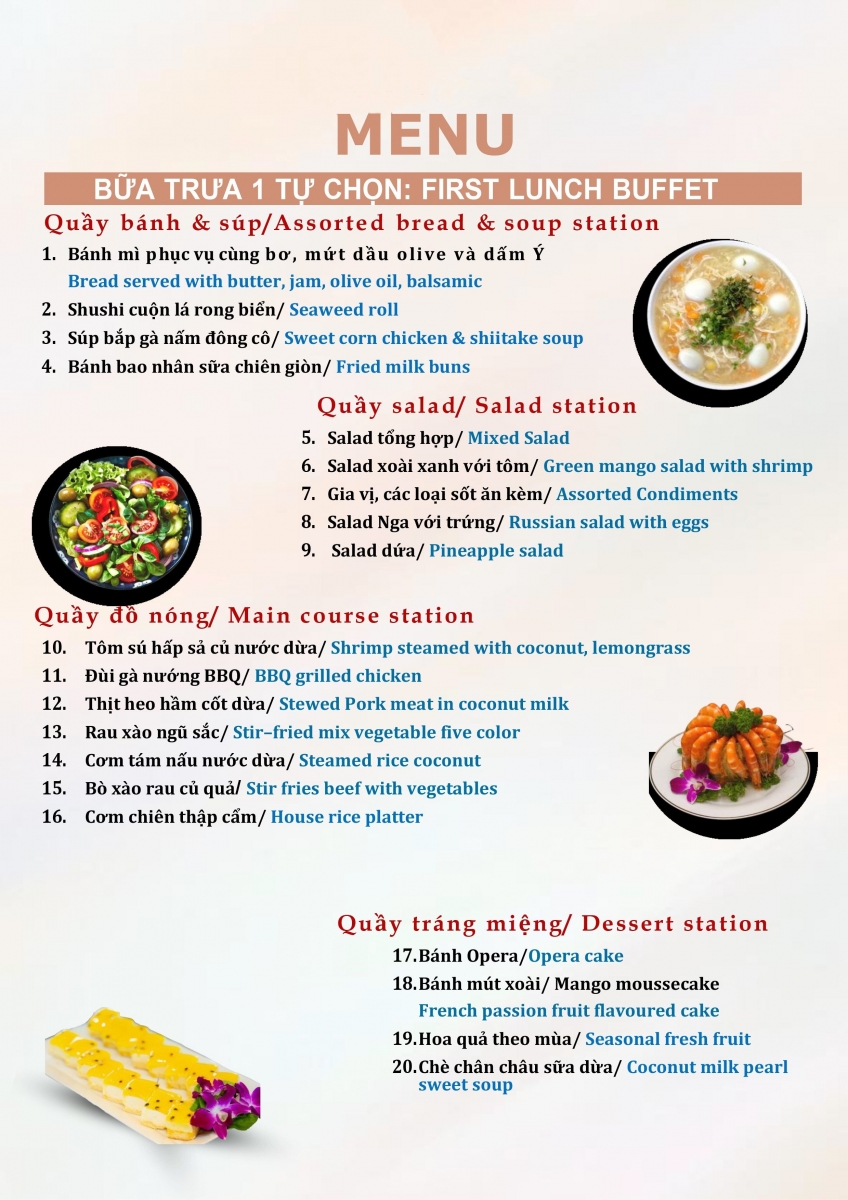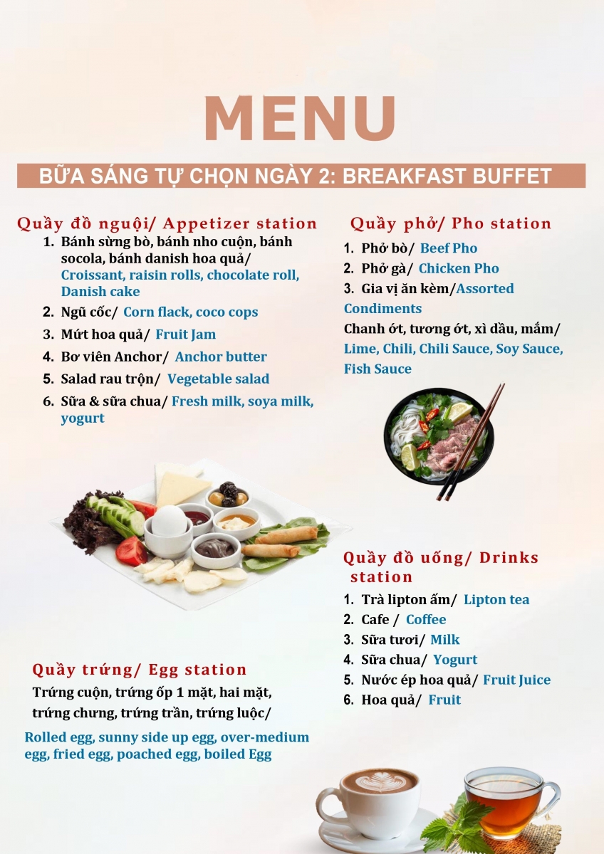- Các bữa ăn theo chương trình: 2N1D ( 1 bữa sáng + 02 bữa Buffet+ 01 bữa tối )